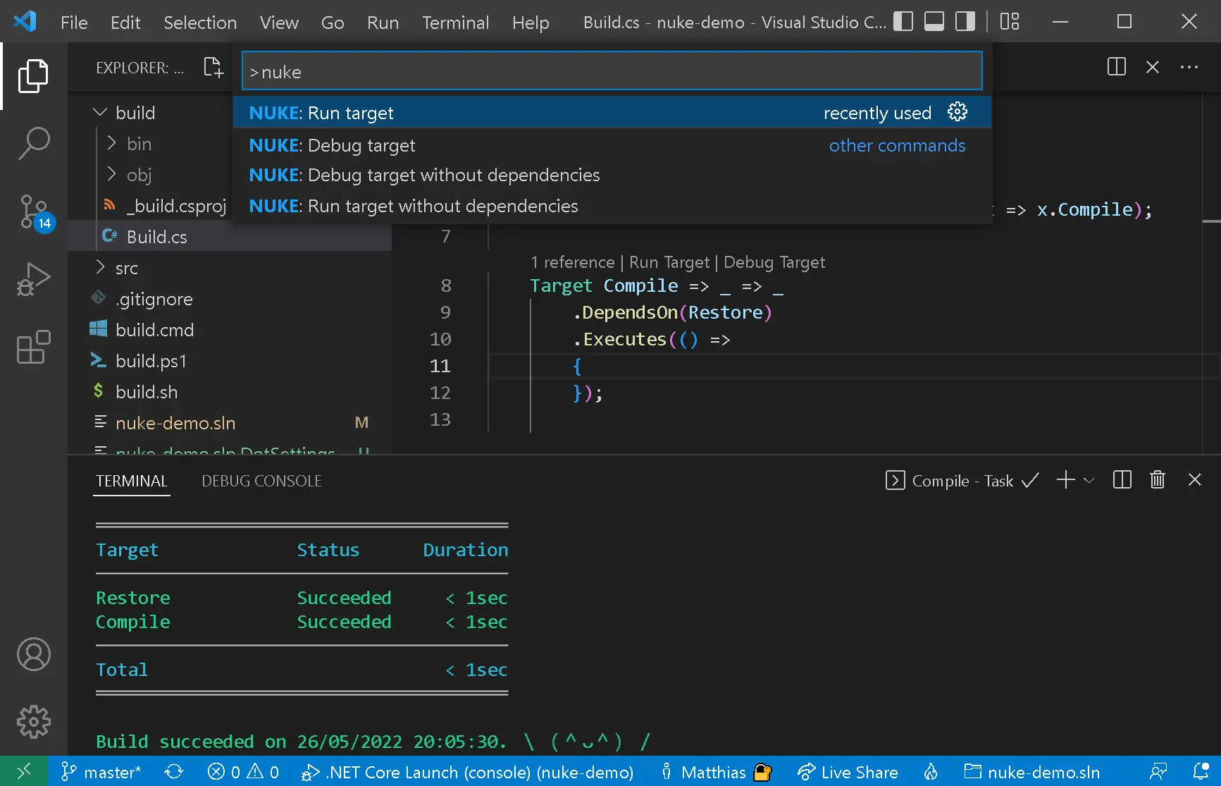 In Visual Studio Code you can install the NUKE Support extension to be more productive in writing, running, and debugging your builds.